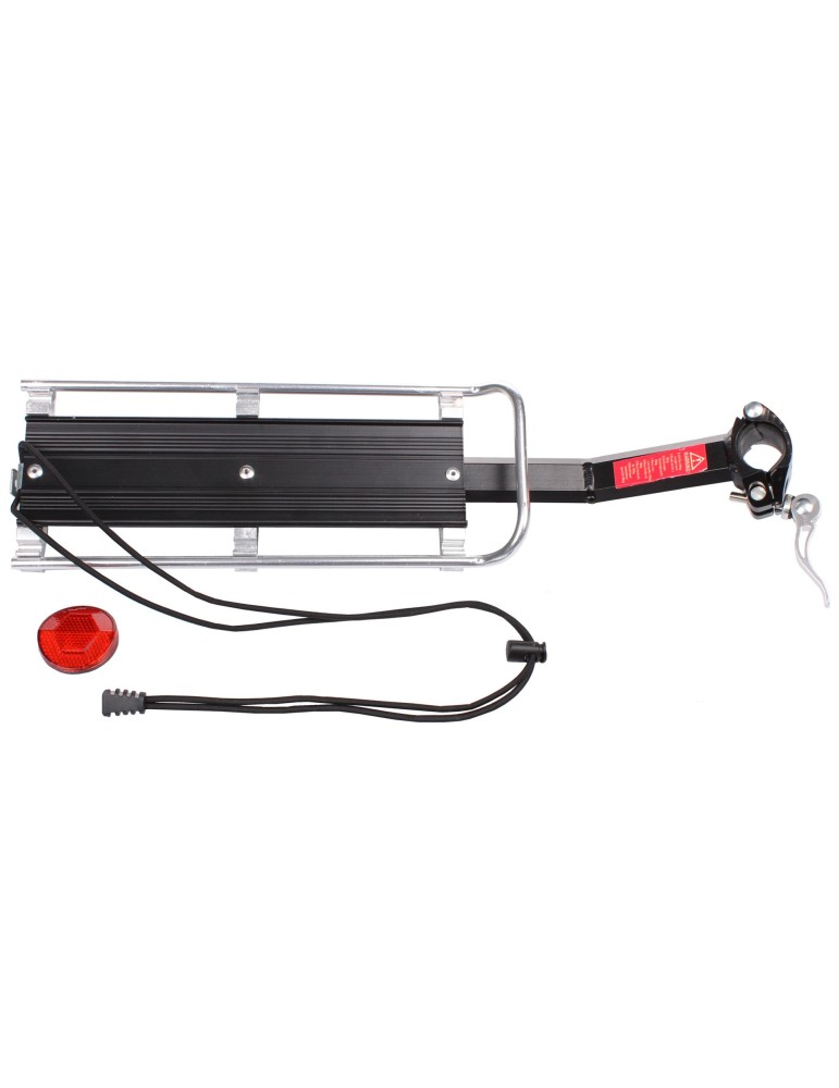 - Bezpečnostné prvky – Súčasťou nosiča je gumolano na upevnenie nákladu a bezpečnostná odrazka, ktorú ľahko pripevníte na zadnú časť nosiča.